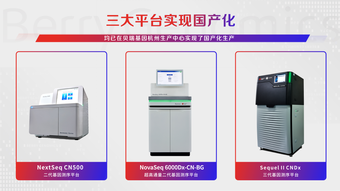 貝瑞基因目前打造了以NextSeq CN500、NovaSeq 6000Dx-CN-BG 以及 Sequel II CNDx 為代表的三大測序平臺(tái)。2019年,NextSeq CN500適用范圍變更獲得國家藥品監(jiān)督管理局批準(zhǔn),成為了適合大規(guī)模臨床基因檢測的NGS通用型平臺(tái);Sequel II CNDx 已通過技術(shù)要求檢驗(yàn),目前處于醫(yī)療器械注冊(cè)申報(bào)中的臨床試驗(yàn)階段;NovaSeq 6000Dx-CN-BG目前處于注冊(cè)檢驗(yàn)階段。自2021年起,三大平臺(tái)均已在貝瑞基因杭州生產(chǎn)基地落地生產(chǎn),實(shí)現(xiàn)了真正意義上的國產(chǎn)化。
